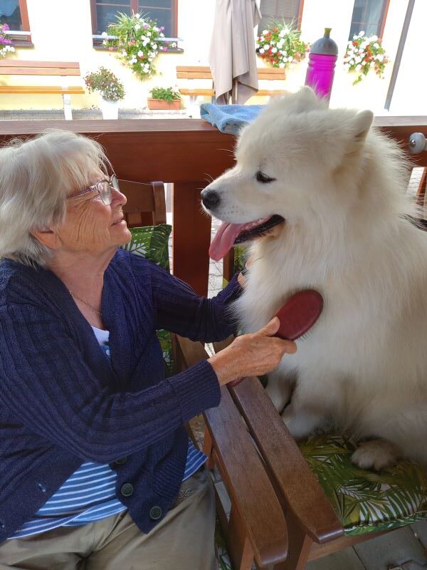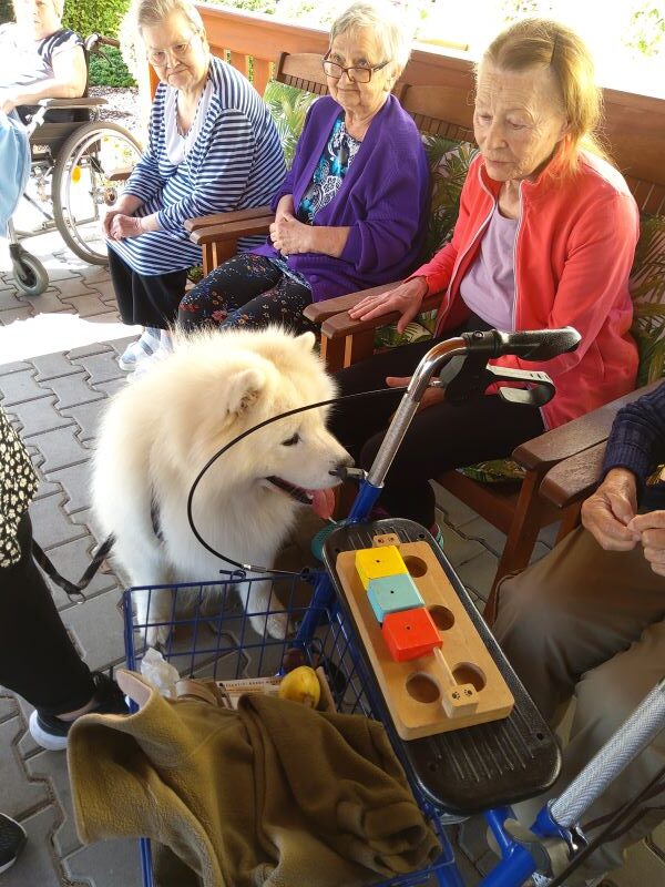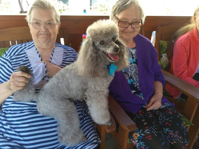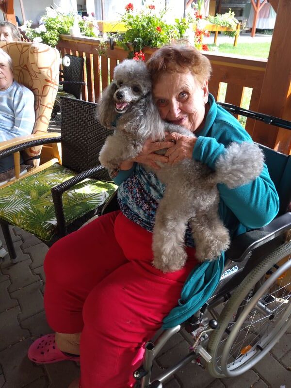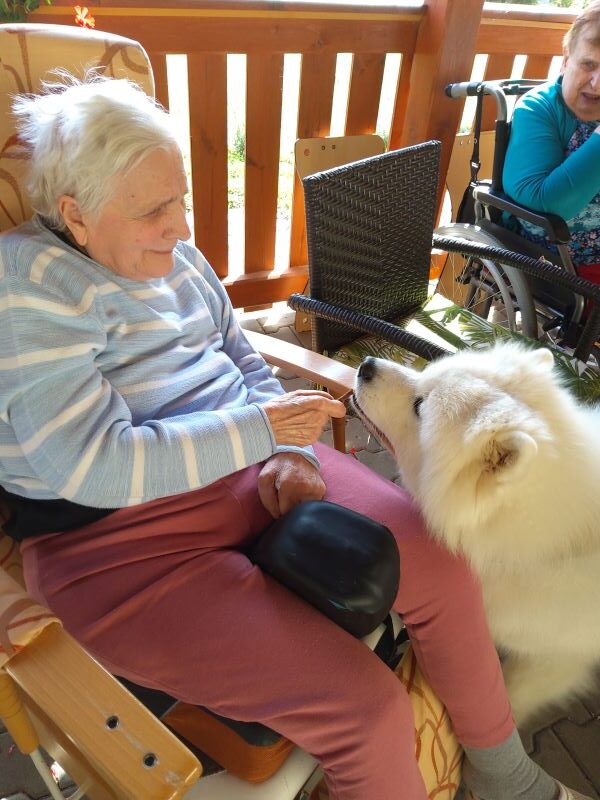Ve čtvrtek 12. června proběhla v našem domově pro seniory další canisterapie. Využili jsme krásného letního počasí a setkání s Chipem a jeho majitelkou ze spolku AnimalTherapy proběhlo na dvorku pod pergolou.