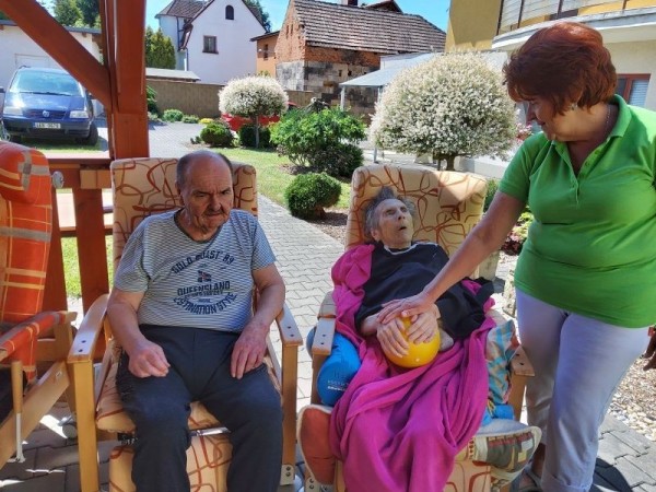 Dvorek našeho zařízení zdobí nádherně kvetoucí květiny, často ale také využíváme pergolu. V jarních a letních měsících je pergola hojně využívána pro společné aktivity, například tu hrajeme společenské hry nebo se tu konají společná rehabilitační cvičení.